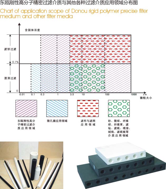 过滤材料有很多种类。“东瓯微滤”是刚性非金属的有机材料分支的一个代表。它以超高分子量塑料为基材,加以相应的添加剂(提高耐温性、抗老化性、化学稳定性)烧结而成的微孔体。具有很高的过滤精度、较好的抗拉强度、很好的化学稳定性、很长的使用寿命。经过二十多年的反复改进与研发形成8种过滤孔径、2种耐温、多种尺寸规格的过滤管与过滤板,或是为客户定制其他的形状。在生产过程中严格控制各道加工工序及成品微孔孔径、比阻、机械强度、孔隙率的检验来确保每一批产品的符合公司的标准,以及保证客户的高效与长寿命使用。